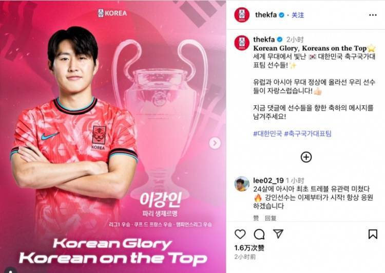 韩国足协今日在官方ins上晒出主题为“韩国荣耀”的李刚仁夺冠海报,并配文写道:“在世界舞台闪耀的韩国国脚!为他们感到骄傲和自豪,他帮助球队登上欧洲之巅!”